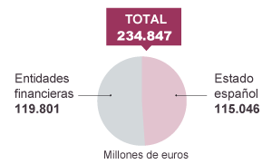 Hasta finales de 2011, el Estado soportó en solitario los daños que la crisis y la mala gestión causó al sector. En 2008 inició un plan de compra de activos (prestó 19.000 millones que han sido devueltos) y estableció una línea de avales para emisiones cuyo saldo vivo es de 81.000 millones. Con este dinero se han atendido las deudas pendientes, pero no se han concedido créditos. En 2009 se creó el fondo de rescate, el Fondo de Reestructuración Ordenada Bancaria (FROB), y prestó dinero (al 7,75% de interés) para reducir plantillas y reforzar el capital. En tres periodos distintos (ver cuadro) se ha ayudado al sector con 14.346 millones.